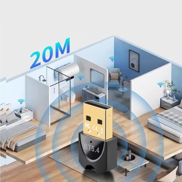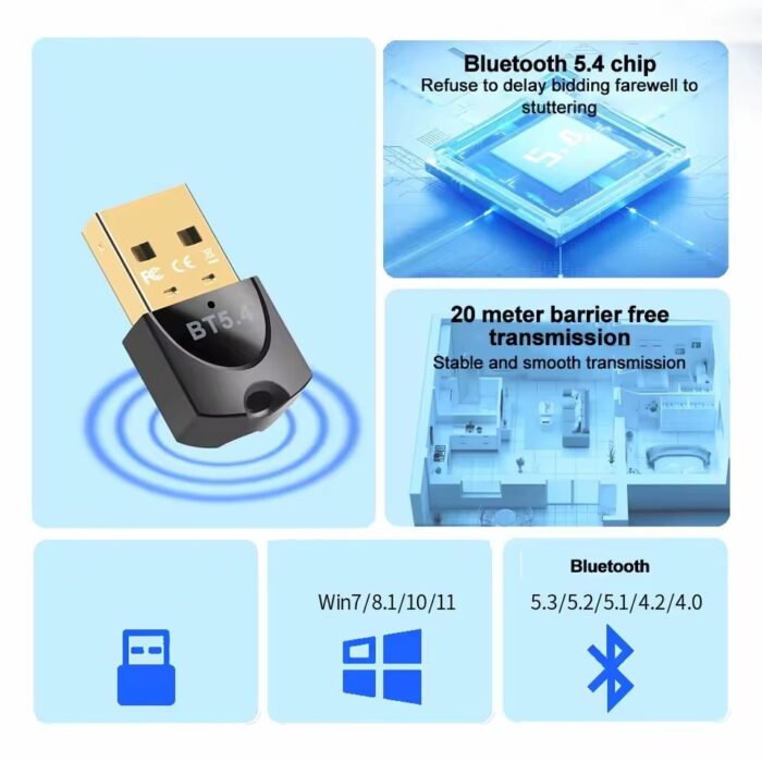 Adaptador USB Bluetooth 5.4 con bajo consumo de energía, transmisión de hasta 20 m, conexión simultánea de hasta 7 dispositivos y compatibilidad.