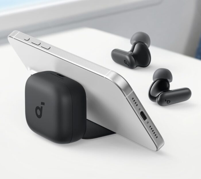El estuche de carga no solo mantiene a salvo y con energía tus auriculares, sino que también funciona como un práctico soporte para tu smartphone, ideal para disfrutar de series, videollamadas o transmisiones sin necesidad de accesorios extra.
