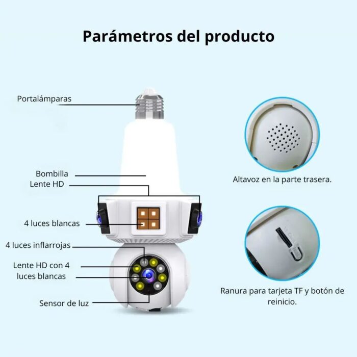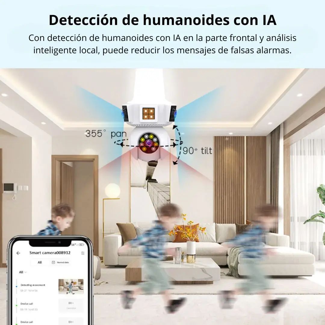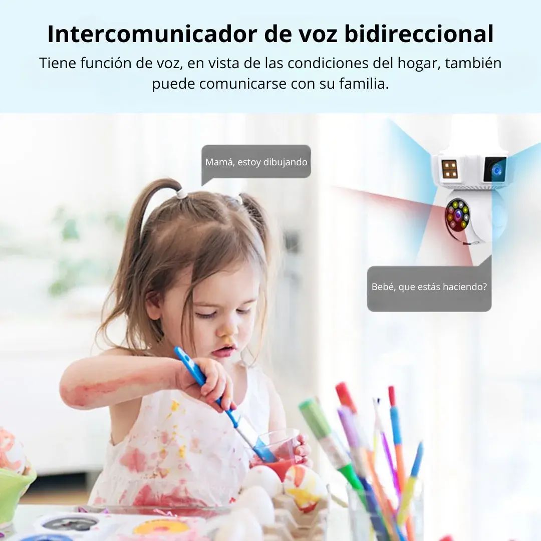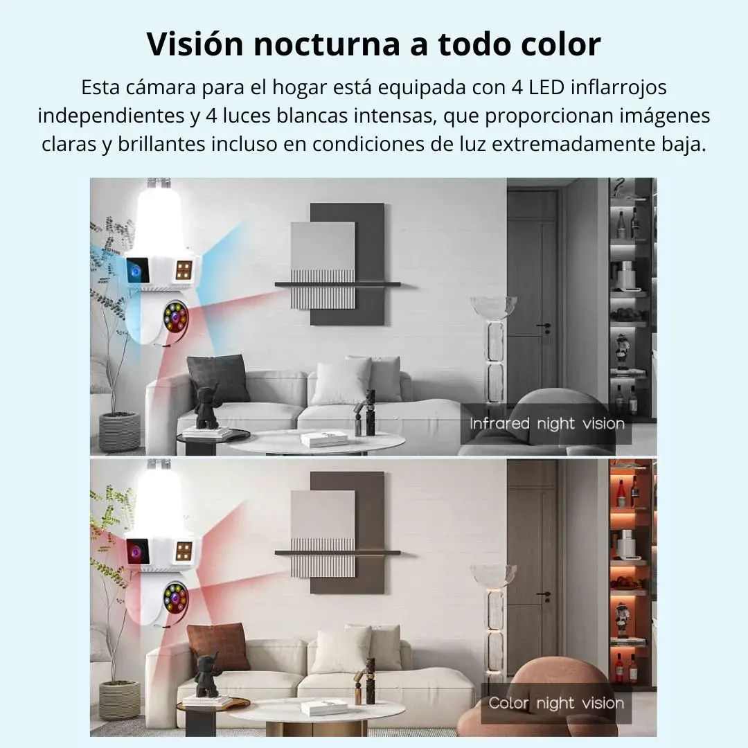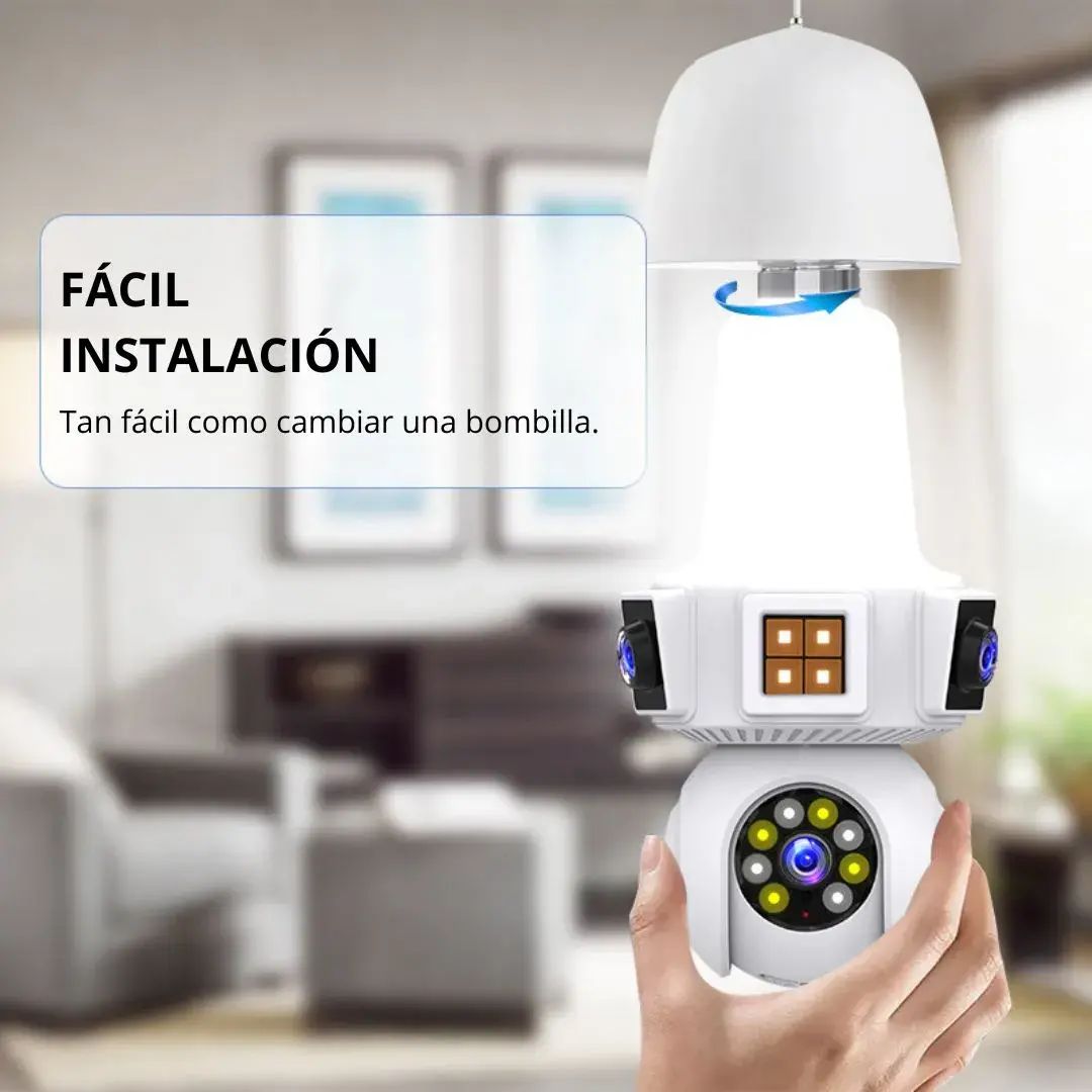 Cámara Doble Lente WiFi E27 – Seguridad Inteligente 3 Pantallas en Tiempo Real