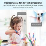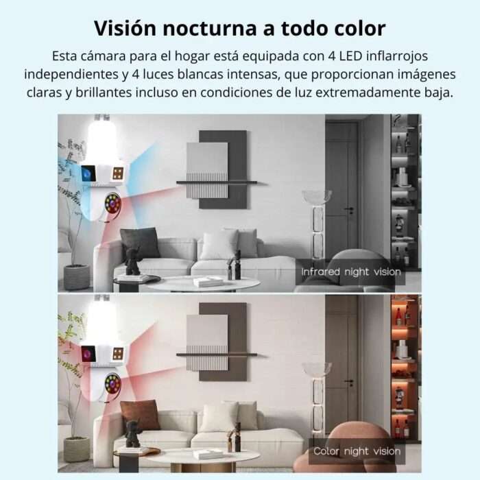 La cámara integra tecnología de visión nocturna infrarroja capaz de detectar movimiento y ofrecer una imagen clara incluso en completa oscuridad. Esto permite vigilar pasillos, habitaciones, negocios u oficinas durante la noche manteniendo la misma seguridad que en el día.