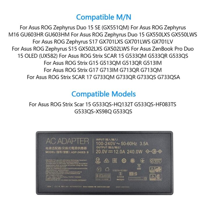 El Cargador Asus Para Laptop De 240W / 20V está diseñado para ofrecer una alimentación fuerte y constante, ideal para laptops ASUS de alto rendimiento utilizadas en juegos, edición de video, diseño gráfico, programación y trabajo profesional intensivo.