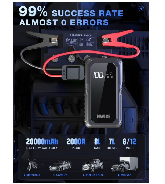 - Lo que incluye: 1 arrancador portátil NWISE TP20PRO, 1 cable de puente inteligente, 1 cable de carga USB tipo C, 1 funda de transporte.