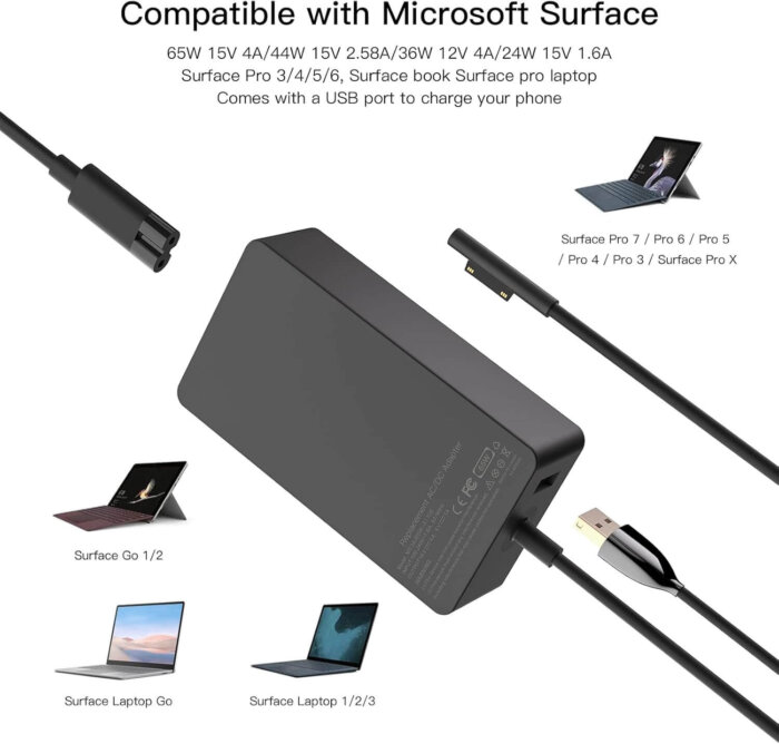Cargador compatible con Microsoft Surface Go, Pro, Laptop y Book. Con salida de 65W y puerto USB 5V-1A, permite cargar múltiples dispositivos.