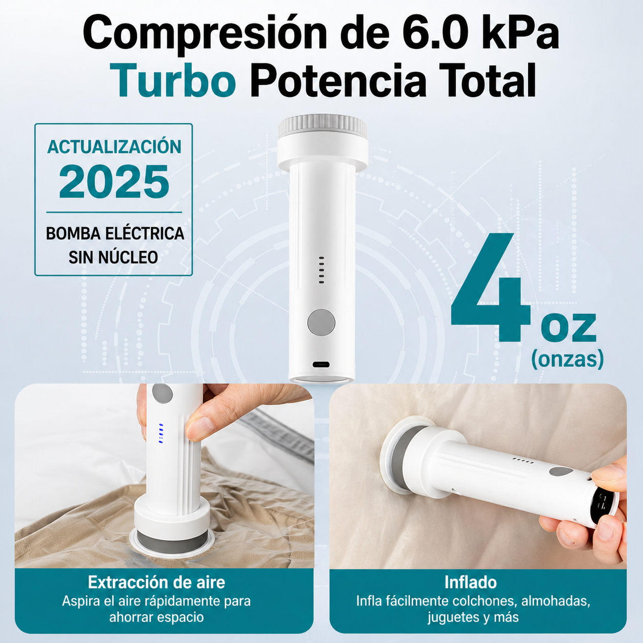 Compresor de aire al vacío portátil con succión de 60KPa y batería recargable. Compacto, potente y fácil de usar, ideal para comprimir ropa y ahorrar.