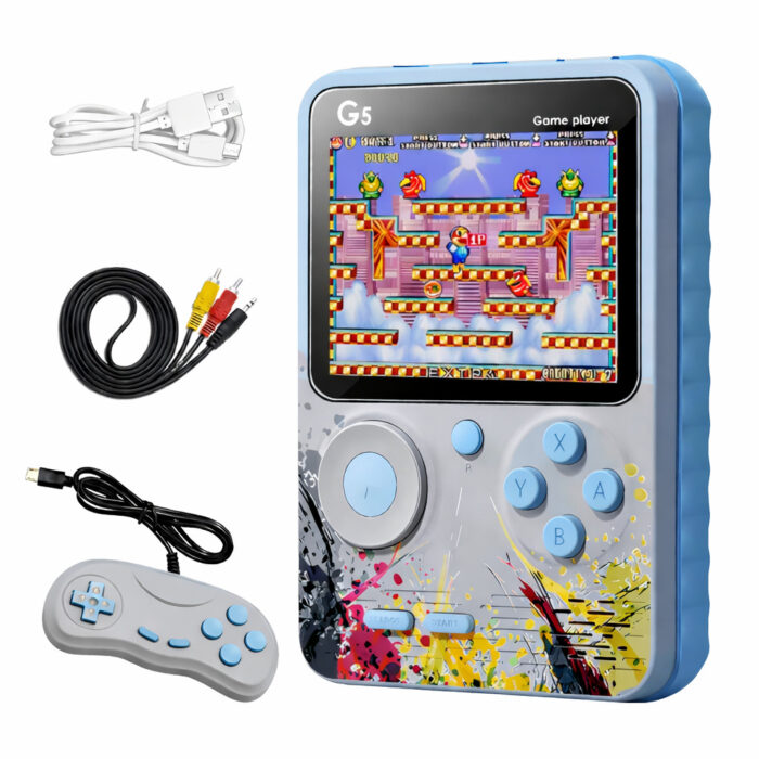 Consola Retro Portátil G5 con 500 juegos clásicos, batería recargable, pantalla HD de 3″ y conexión AV a TV. Ideal para 1 o 2 jugadores.