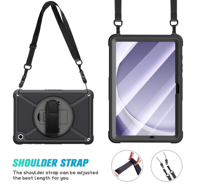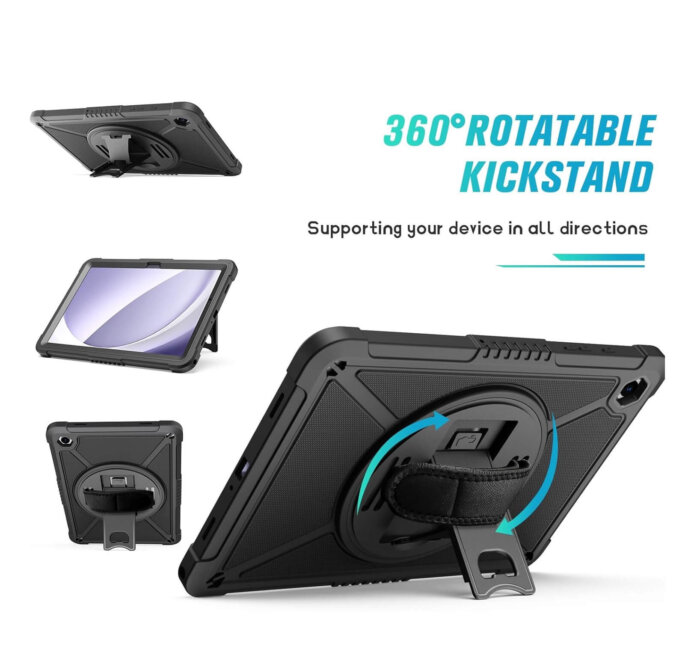 Funda exclusiva para Samsung Galaxy Tab A9 Plus, con soporte giratorio de 360°, correa de hombro ajustable y protección completa contra golpes.
