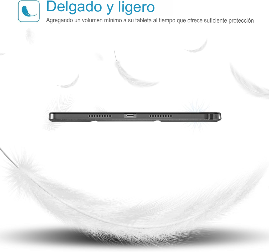 La parte trasera ligera, translúcida y esmerilada resalta el diseño original de la tablet mientras la protege contra huellas dactilares, rayones y el desgaste diario, sin añadir volumen innecesario.