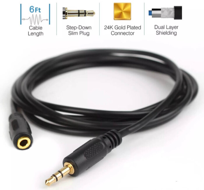 - Cable de extensión de audio estéreo premium de 3,5 mm diseñado con cubierta de PVC suave, conectores de metal pulido y anillos de alivio de tensión que aumentan la flexibilidad y la durabilidad.