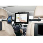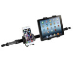 - Este soporte especial para reposacabezas para tabletas está montado en el automóvil entre ambos asientos delanteros y contiene dos soportes: uno para tabletas de 7 a 11 pulgadas y otro para una tableta o teléfono inteligente más pequeño de hasta 95 mm de ancho.