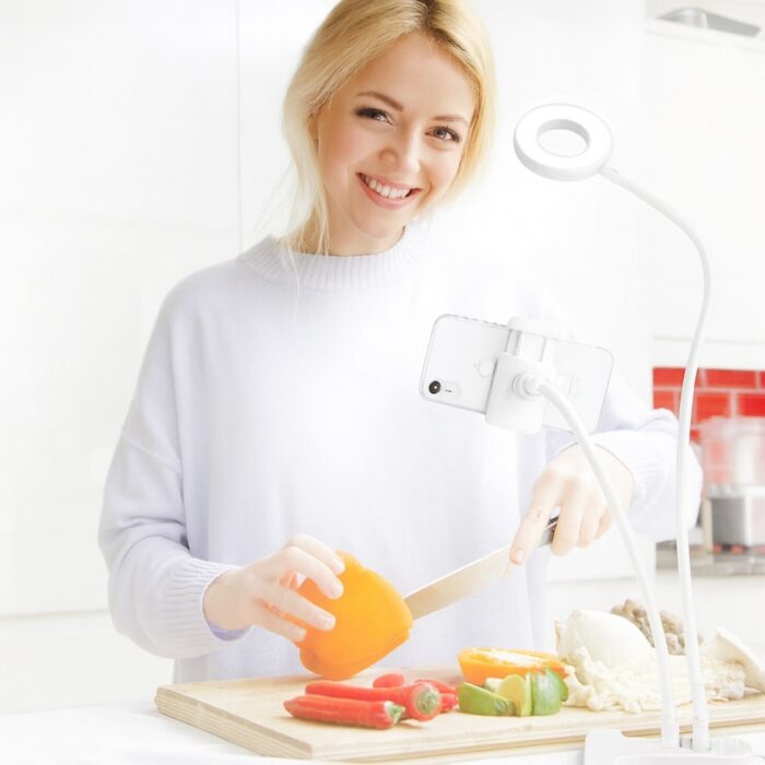 Este soporte de cámara web con luz de anillo está diseñado para mejorar tu presencia en videollamadas, transmisiones y grabaciones. Gracias a su sistema manos libres, puedes sujetarlo a mesas, escritorios o incluso a la cama, logrando siempre el ángulo perfecto. Su diseño flexible te da libertad total de movimiento para trabajar o crear contenido con comodidad.