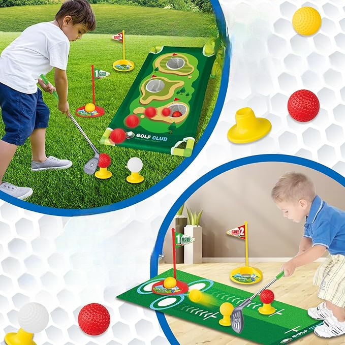 Kit De Golf Infantil con palos ajustables, 27 piezas, alfombrilla y cornhole. Ideal para niños juego interior y exterior.