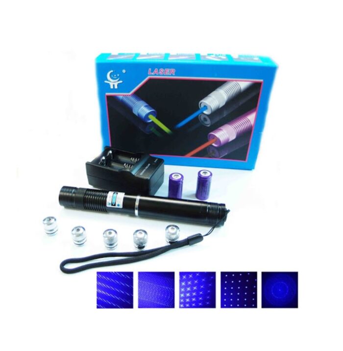 Láser azul de 5000 mW con alcance de 10 km, enciende fósforos y crea efectos 3D. Ideal para astronomía, senderismo y uso profesional.