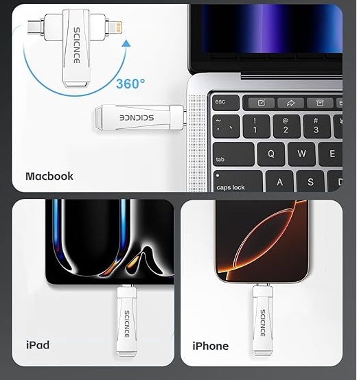 La memoria USB SCICNCE de 512GB es una solución práctica y eficiente para almacenar, transferir y respaldar tus archivos de forma rápida y segura. Gracias a su diseño multi-interfaz, permite transferir datos fácilmente entre iPhone, iPad, Android y computadoras sin depender de cables, iTunes o iCloud.