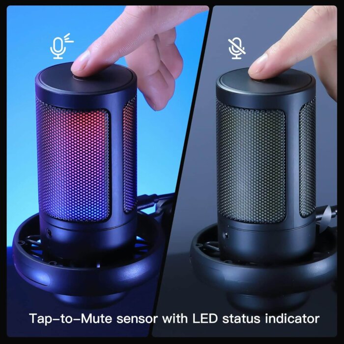 - Iluminación RGB colorida: el micrófono para juegos cuenta con impresionantes efectos de gradiente multicolor dinámicos para ayudar a que tus videos de juegos y transmisiones en vivo lleguen a más espectadores. La rica iluminación RGB del micrófono para juegos está integrada con coloridos accesorios de computadora para satisfacer las necesidades de un ambiente más de juego. Cuando el micrófono esté funcionando, mantén presionado el botón táctil en la parte superior del micrófono durante 3 segundos para encender/apagar la iluminación RGB.