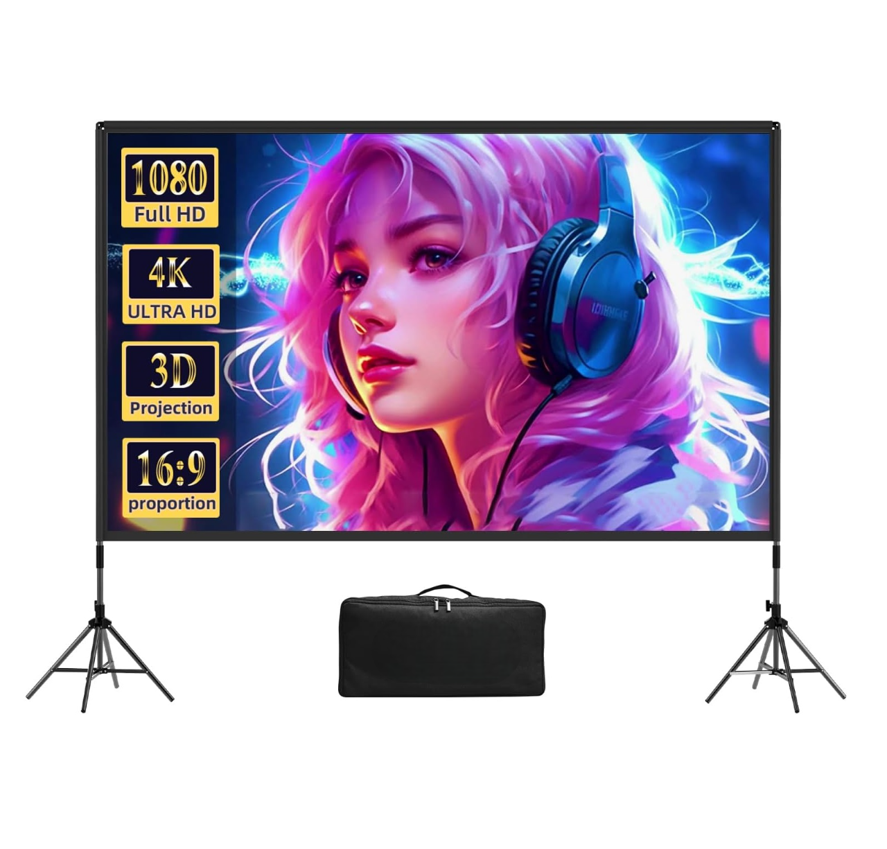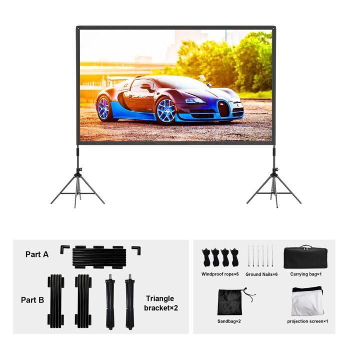 Pantalla de Proyección 120″ con soporte, proyección 4K frontal y trasera, fácil de montar y portátil. Ideal para cine en casa o al aire libre.