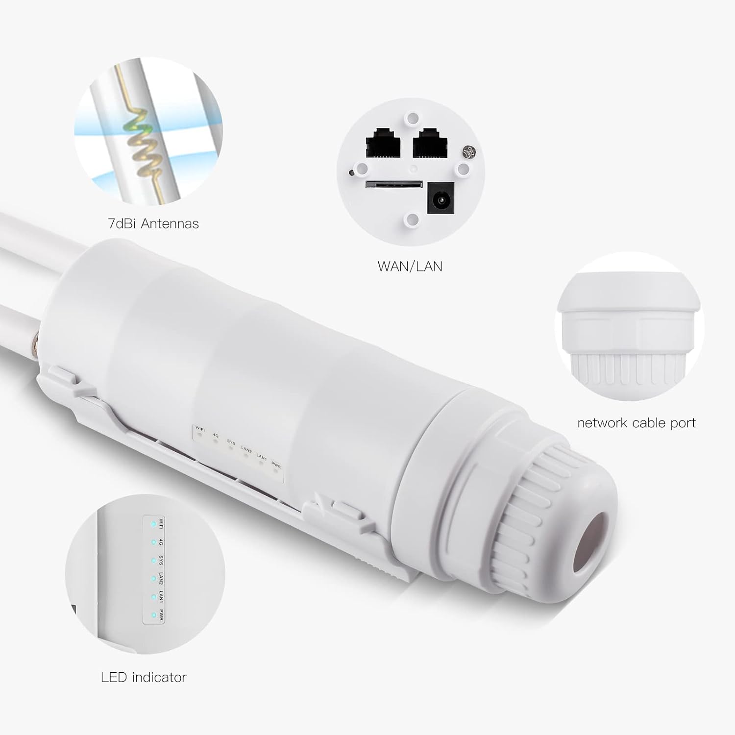 Router WiFi exterior 4G LTE con hasta 150Mbps, cobertura amplia y protección IP67. Soporta hasta 64 dispositivos y ofrece conexión.