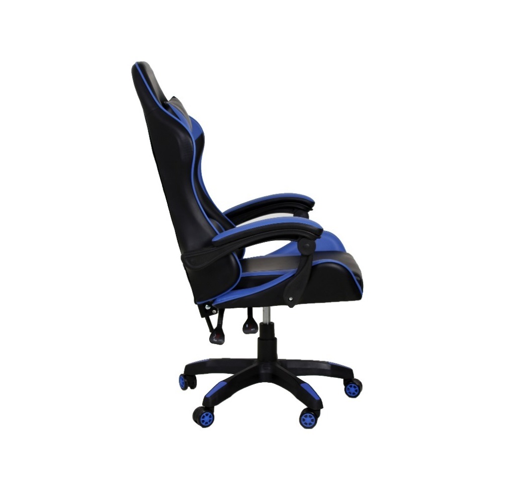 Silla gamer ergonómica azul y negra con relleno de poliuretano inyectado, soporte lumbar y cabecera ajustable. Reclinable multiposición con bloqueo.