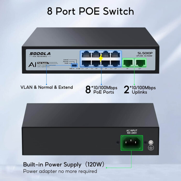 - 【Conmutador PoE Ethernet de 100 Mbps】8 puertos PoE+ de 10/100 Mbps (802.3at/af) y 2 enlaces ascendentes de 10/100 Mbps, presupuesto de energía de hasta 30 W por puerto PoE y 120 W para el conjunto.