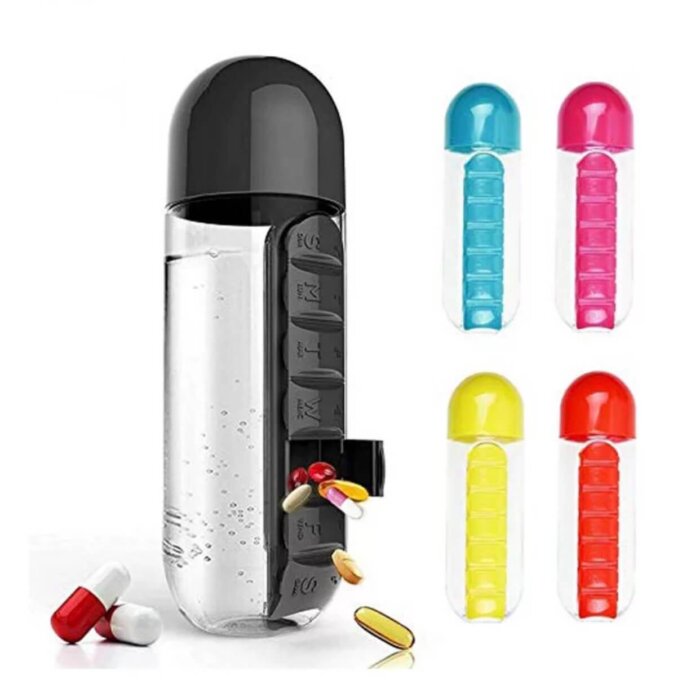 Amplia aplicación: combina tu organizador diario con tu botella de agua. La botella tiene capacidad para 600 ml de tu bebida favorita, además de un organizador de pastillas integrado con 7 compartimentos separados para cada día de la semana.