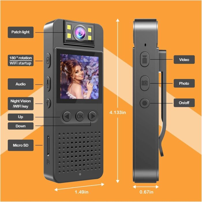 La Videocamara De Bolsillo HONGHOO graba en Full HD 1080P, asegurando imágenes nítidas y detalladas en cada uso. Además de video, permite capturar fotos y grabar audio con facilidad. Su sistema de visión nocturna avanzada con 4 luces LED de alta intensidad ofrece claridad excepcional en la oscuridad, hasta 5 metros (16 pies). La pantalla LCD de 1.4 pulgadas facilita la reproducción en tiempo real y la gestión de archivos directamente desde el dispositivo.
